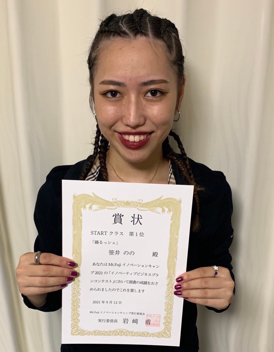 笹井 のの 氏 山梨県立大学在学中の2021年度STARTクラスに出場。 現在は、筑波大学人間総合科学学術院人間総合科学研究群(博士前期課程)体育学学位プログラム在学中。 出場時のビジネスプラン ストリートダンスのための機能性を重視した専用シューズ"踊るっシュ" の開発。
