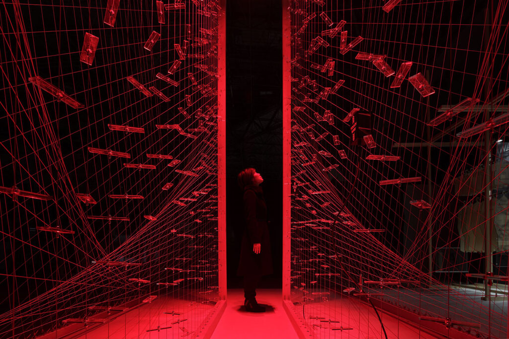 伊東:インテリア商材の展示会では、ワイヤーシステムの会社のブースデザインを担当したことがあります。展示した大量のワイヤーに電気センサーを仕込み、触れるとブースの照明の色が変化するという仕掛けを施しました。電気センサーというプラスワンの機能を仕掛けることで、本来は何かを吊るすためのものであるワイヤーが、「魅せる」ものに変わる。テクノロジーを用いてものの見え方を演出するというのは、スク―ミーボードでも実践できるのではないでしょうか。