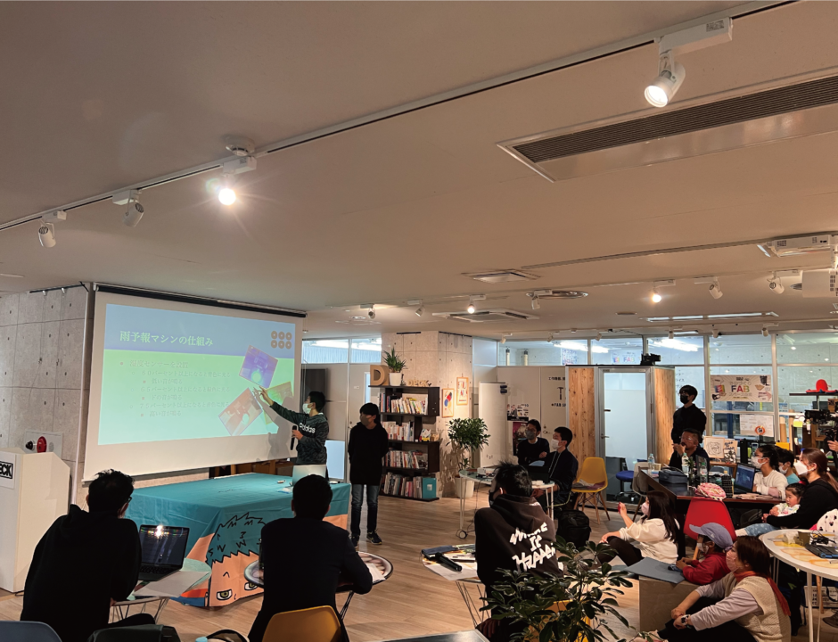 工学専攻者やエンジニアの参加者はプログラミングに不慣れな小中学生にアドバイスをし、小中学生は他参加者に子どもならではの斬新なアイデアを授けました。他にも、互いにセンサーや発表資料のフィードバックを送りあい、改善していくことで最終的な完成度が高まりました。