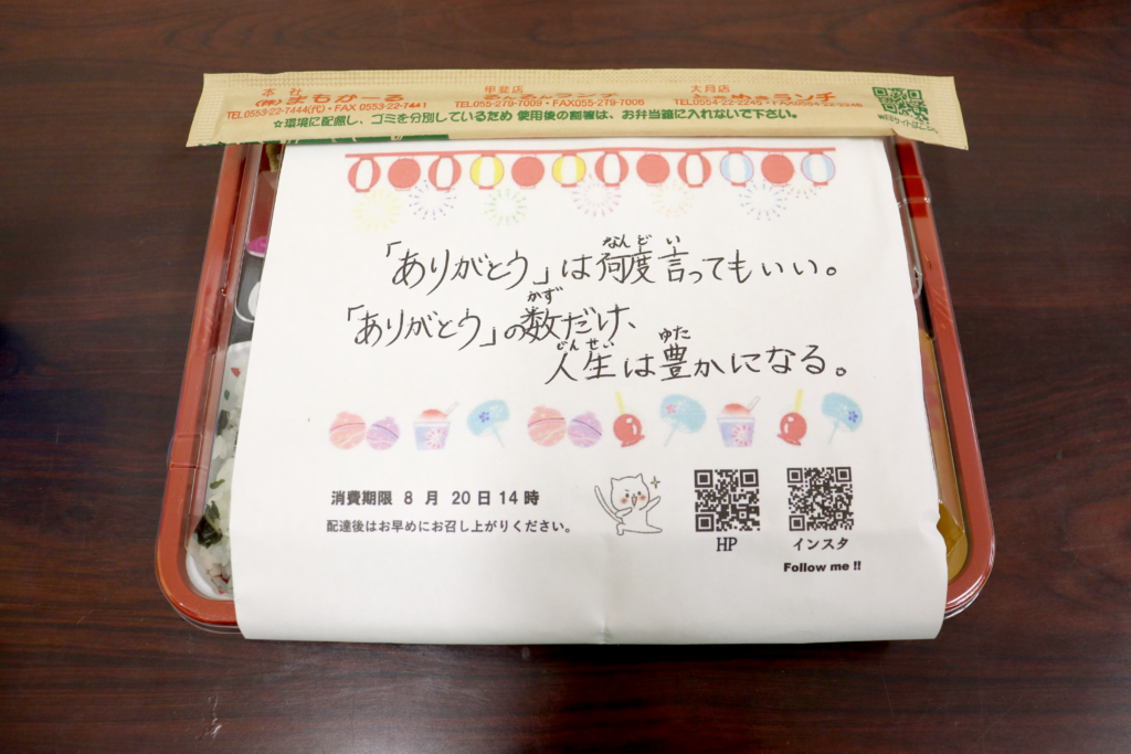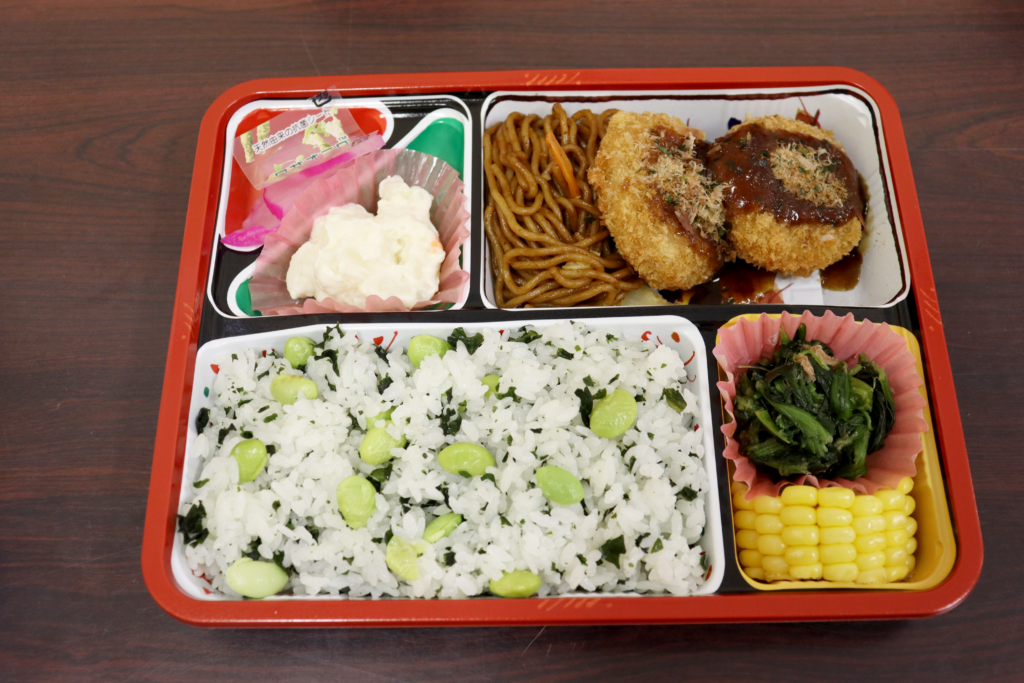 昼食のお弁当を提供するのは、株式会社まもかーる。毎月TSAのために、栄養バランスを考えた特別メニューのお弁当が用意されています。この日は8月ということもあり、お祭り気分が味わえる焼きそばとたこ焼き風味のコロッケがメインディッシュに。デザートにはかき氷も用意され、おかわりする子どももいるほど、夏らしい味を楽しんでいました。