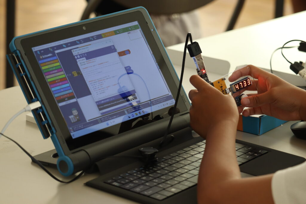 IT/IoTスキルのコンテンツを提供するのは、株式会社スク―ミー。スク―ミーボードとPCが貸し出され、実践的な授業が行われました。まずは数字が表示されるセンサーコネクターを活用して、子どもたちのアイデアをもとに対戦形式のゲームを実施。ゲームに勝つためにはどんな設定が必要なのかを考え、PCでプログラミングし、それらを即座にスク―ミーボードに反映して先生や仲間と対戦する。この作業を繰り返すことで、自然とプログラミング的思考が養われていきました。最後は子ども同士で教え合いながら、数字の表示とLEDライトを組み合わせたオリジナルゲームをつくりました。