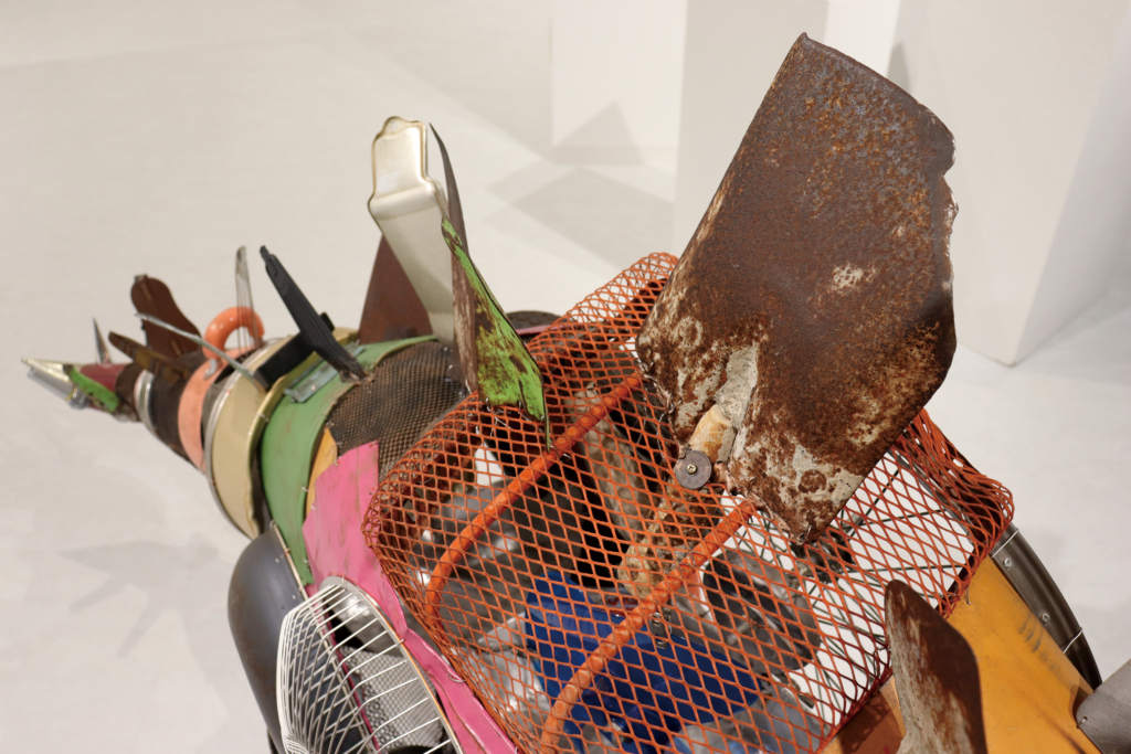 錆びなども非常にロマンチックだなと感じます。もし材料の全てが新品だったら、もっと冷たくロボットのように見えてしまうかもしれません。しかし錆びや使い込まれた風合いが加わることで、金属ながらも温かさを感じることができます。年月を経てできた錆びや鍋の焦げた跡など人が使っていた痕跡が味わいとなり、作品の生きものに馴染んでくれるおかげで、優しい表情の作品になっていると思います。