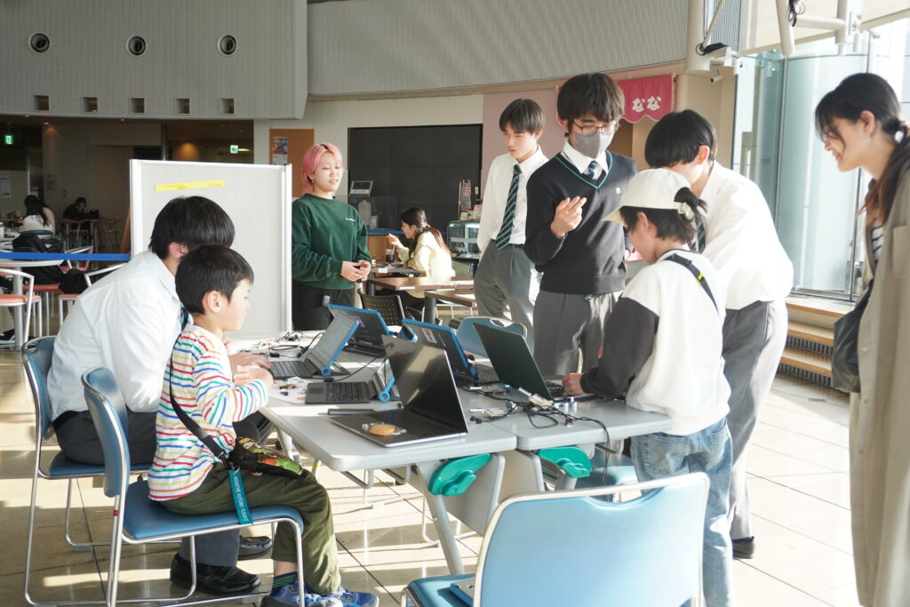 会場には小さなお子さんからご高齢の方まで、年代を問わずブースに立ち寄ってプログラミングを楽しむ姿がありました。自分たちのつくったeDIYをたくさんの人が楽しんでくれたこと、その場で一緒に新しいアイデアを形にした経験は、高校生たちにとって大きな学びになったことでしょう。