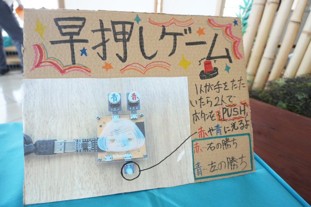 イベント当日。高校生が発案・開発した「カードリーダー」「早押しボタン」「マシュマロゲーム」「チキチキパーキング」が並びました。